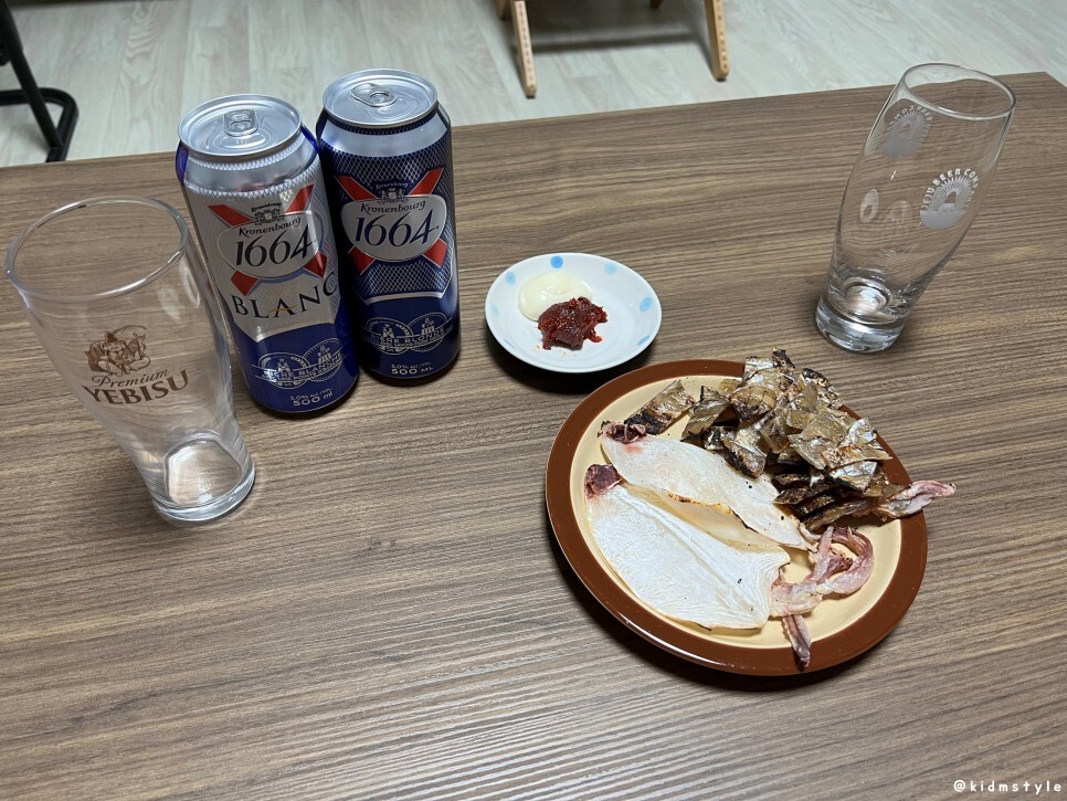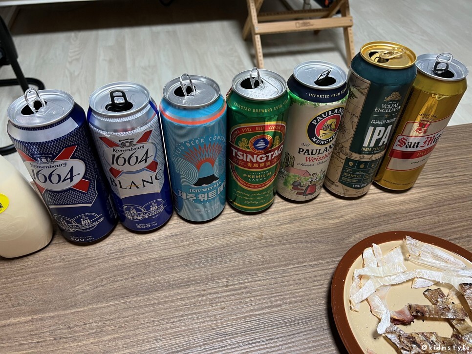 가볍게 맥주 한잔 끝. 한치와 쥐포가 많이 남았다. 남은 건 일회용 비닐봉지에 넣어서 다음날 맥주 안주로 먹었다는 후문. 어쩌다 보니 술장고에 맥주가 종류별로 있었네. 맛있게 잘 먹었다.