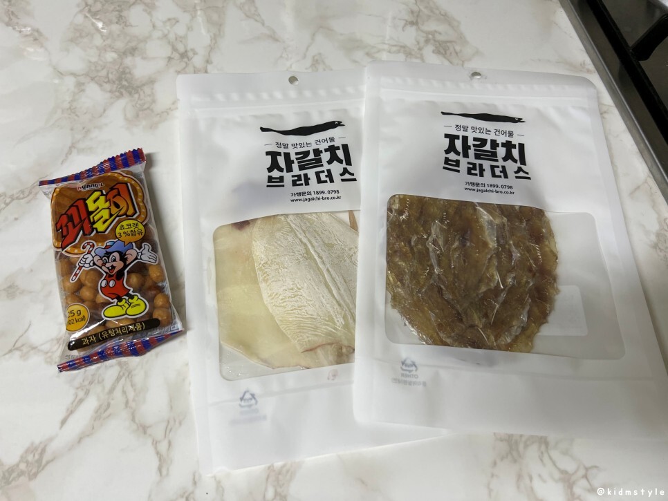 꾀돌이는 서비스로 끼워준 과자, 오늘 안주는 한치와 쥐포이다.
