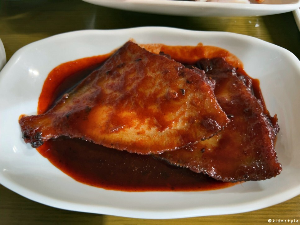 납세미 (가자미) 조림인데 양념이 과해 보이는데 상당히 맛있다. 전혀 맵거나 짜지 않고 입에 착착 달라붙는다. 각 잡으면 이걸로 소주 몇 병 가능하다.