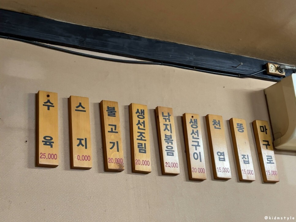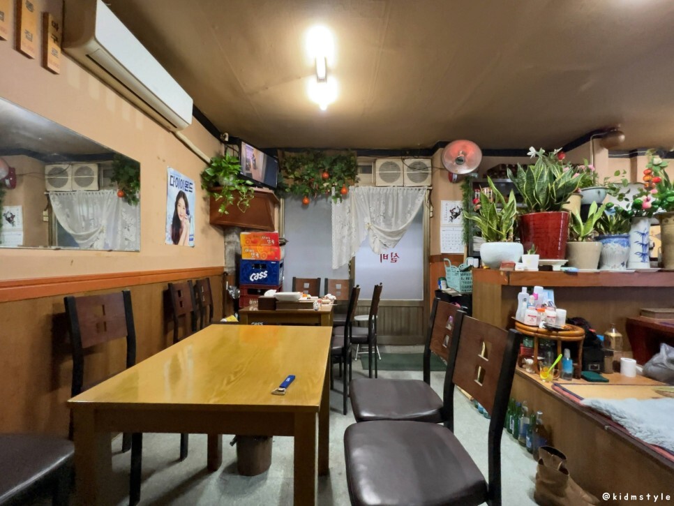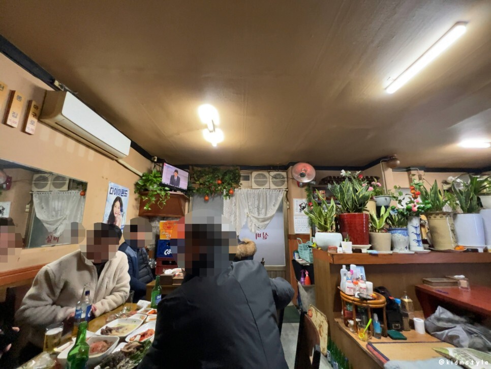 이런 분위기이다. 인스타 갬성, 여유, 깔끔을 따진다면 이 집은 비추한다. 옆자리 대화가 다 들리고 옆자리 손님과 대화가 통하면 소주 한 잔 주거니 받거니 할 수 있는 인싸만 방문을 추천한다. 나 역시 그래서 방문했다.