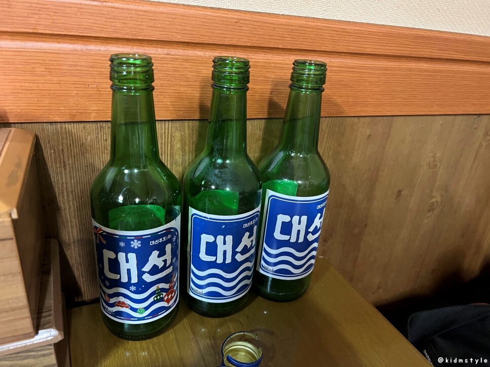 한 상 가득 차려진 테이블이다. 너무 맛있다. 열심히 기본 안주를 먹고 있었다. 부산 사람 부산 소주 대선 소주를 메인 안주 나오기 전에 이미 한 병 까고 한 병 더 주문.