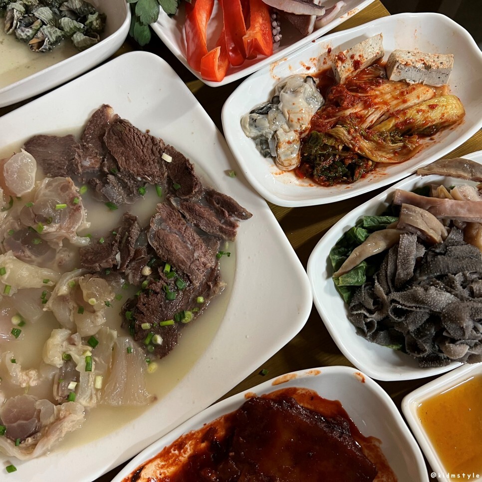 이어서 안주들이 도착한다. 두당 얼마의 실비집이 아닌 25,000원짜리 스지 수육을 주문했는데 이렇게 나온다. 개인적인 생각이지만 근처의 실비 골목보다 훨씬 낫다고 본다.
