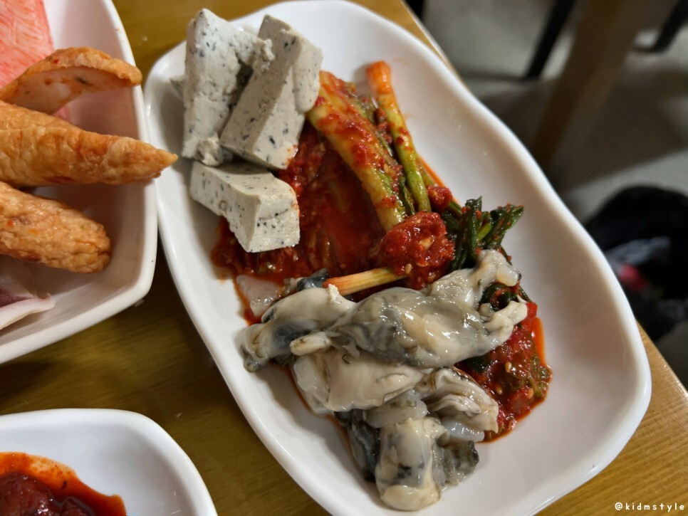겨울에만 맛볼 수 있는 별미 굴이다. 그리고 두부와 김치, 파김치인데 여 사장님이 직접 담은 거라 상당히 맛있다. 맛을 안 볼 수가 없다. 솔직히 꿀맛이다.