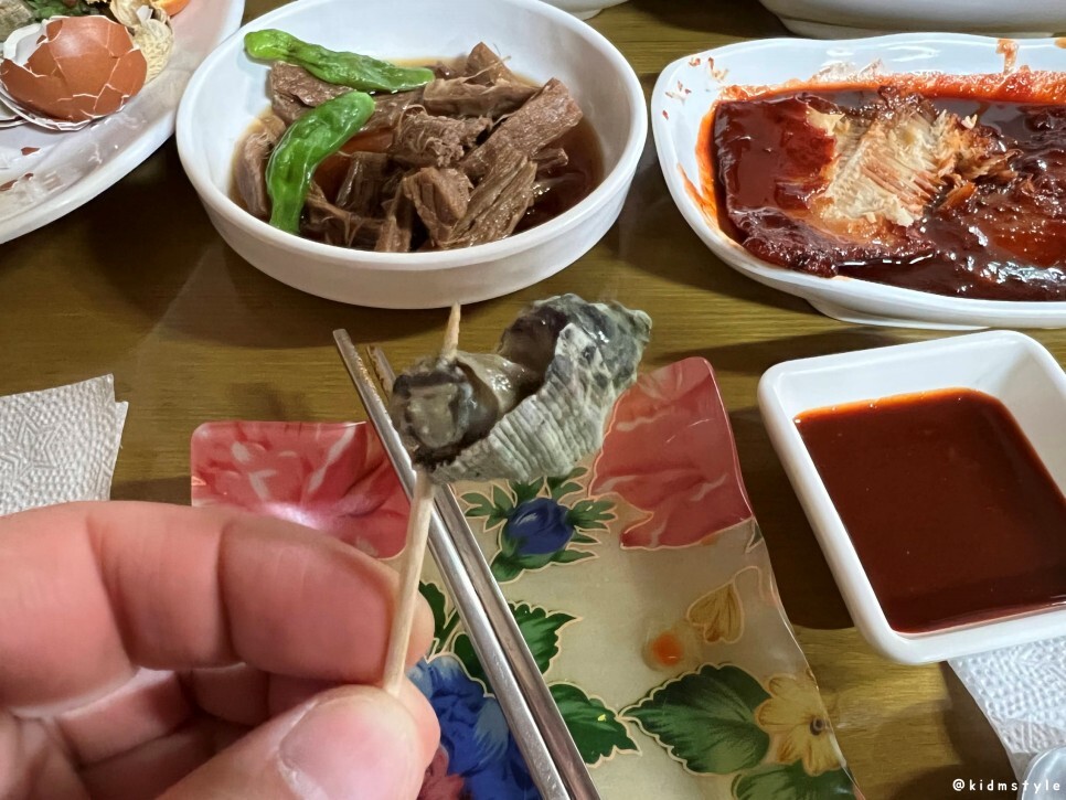 고동은 이쑤시개로 열심히 꺼내서 먹는다. 위에 보니 그 와중에 가자미조림 열심히 먹었네.