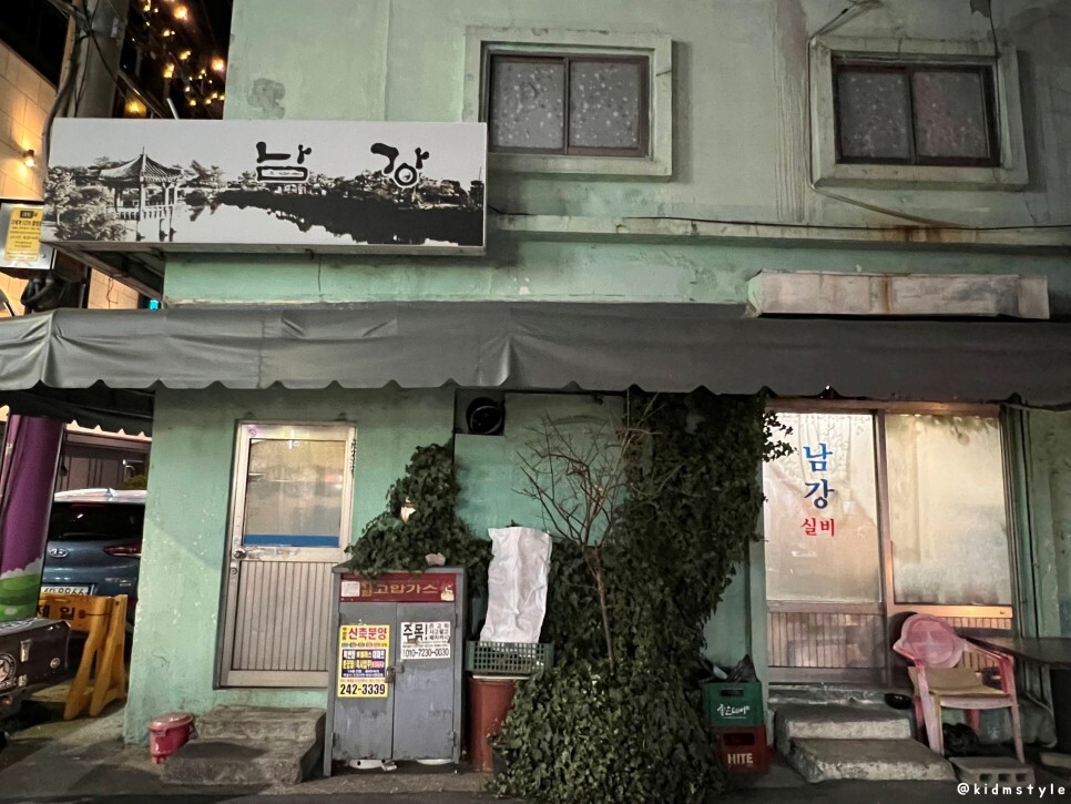 부평동 우리은행 뒷골목 코너 바리에 바로 보이는 간판이다. 진주 남강의 멋진 모습이 수묵화처럼 간판에 그려진 곳, 남강실비이다. 화장실은 외부에 있고 보다시피 아주 작은 술집이다.