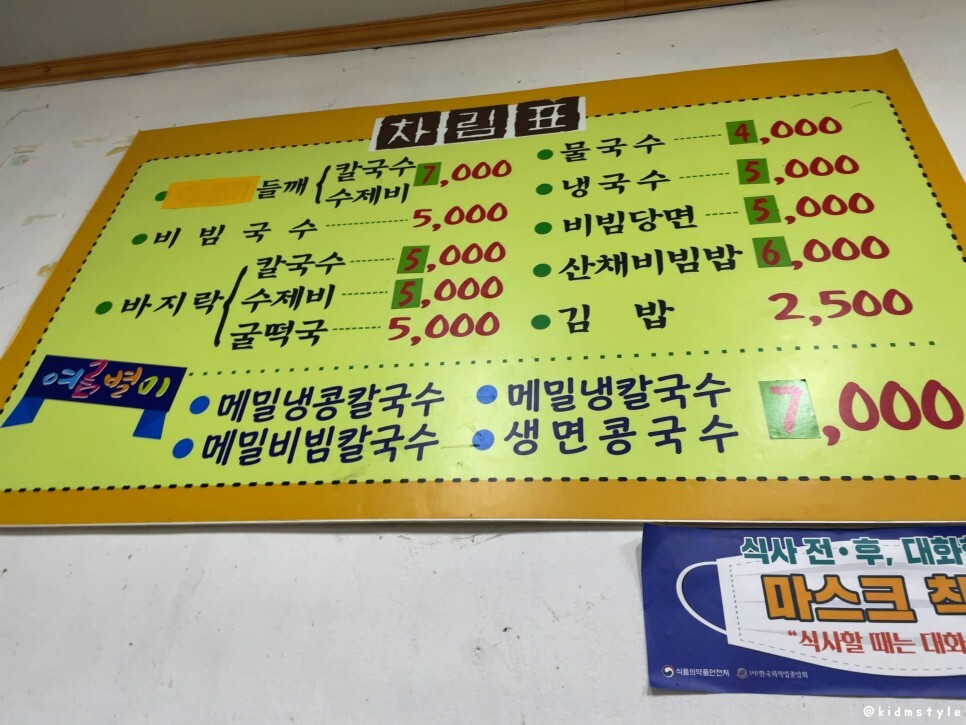 메뉴판을 찍어보았다. 가격이 조금 올랐다. 하지만 바지락칼국수는 아직 5,000원이라 괜찮은 편, 나는 오늘 들깨 칼국수를 맛보려고 한다. 가격은 7,000원이다. 테이프로 가려놓은 것은 원래 이 메뉴가 다슬기 들깨 칼국수였는데 다슬기가 빠져서 조금 아쉽지만 기대된다.