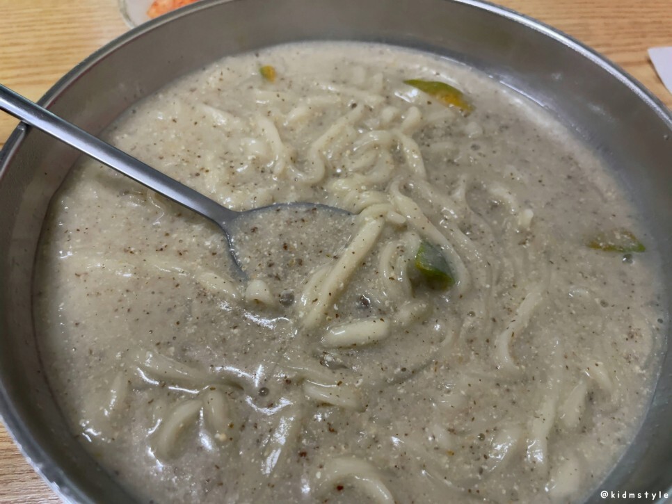 들깨 양이 상당하다. 내가 먹어본 들깨 칼국수 중에서 들깨가 가장 많이 들어가 있는 것 같다. 들깨 국물을 한 숟가락 떠먹으면 살금살금 다가오는 짭짤한 맛이 느껴지는데 이 부분이 킥이며 입맛을 상당히 돋운다. 입맛 없을 때 이집 들깨 칼국수 한 그릇 맛보면 입맛이 싹 돌아온다.