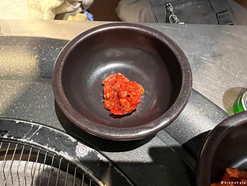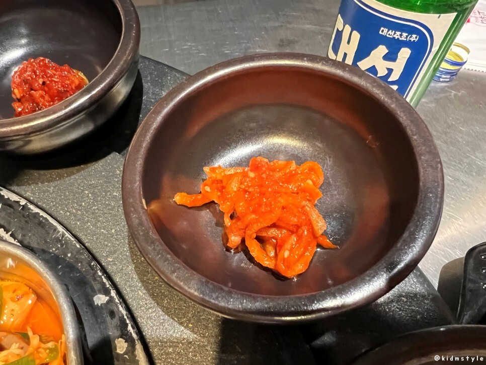 추가로 부안오득살 1인분 (9,900원)을 주문해 보았다. 오득살은 돼지 한 마리에서 100g 정도 나오는 특수부위인데 부챗살의 연골 부위에 칼집을 내서 특제 양념을 한 메뉴이다. 어찌 보면 원조부안집이 인기를 끌게 된 시그니처 메뉴이다.