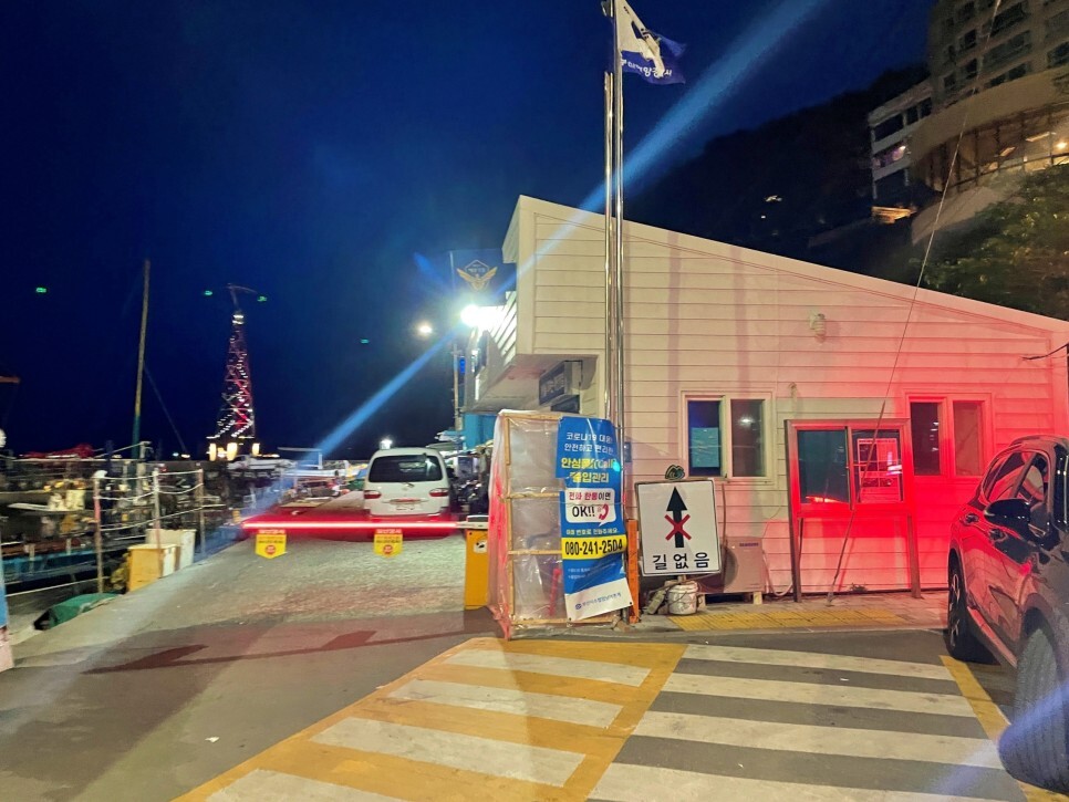 송도해수욕장 끝에 차를 돌리는 회차로가 있습니다. 그리고 해경 초소가 보입니다. 정면 안쪽으로 들어가면 됩니다. 오른쪽에는 암남공원으로 가는 길이 있는데 작년 태풍 때문에 열심히 복구 중입니다.