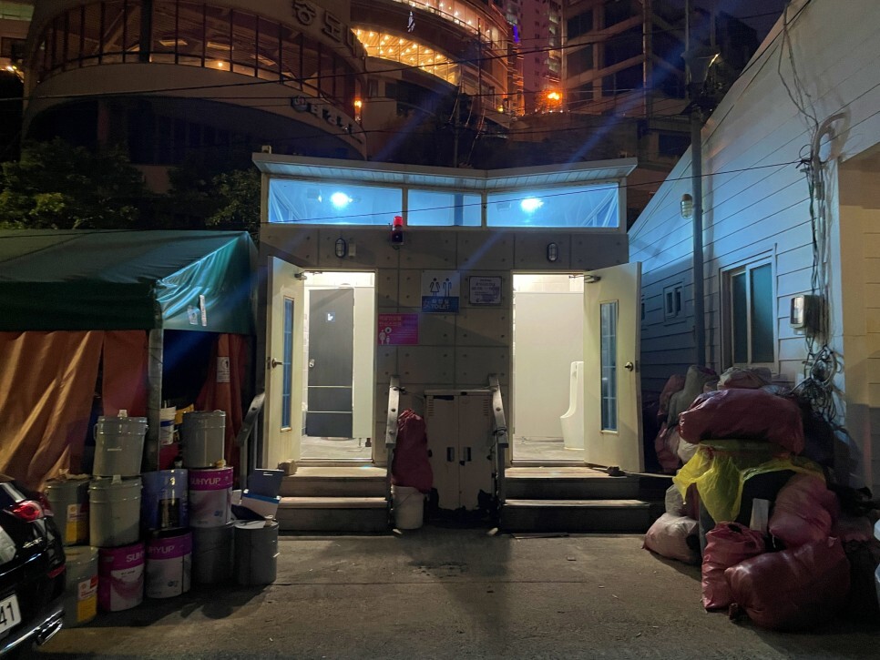 오늘 가볼 곳은 포장마차이다 보니 화장실이 따로 마련되어 있지 않습니다. 용무가 급할 때는 공중 화장실을 이용하면 됩니다.