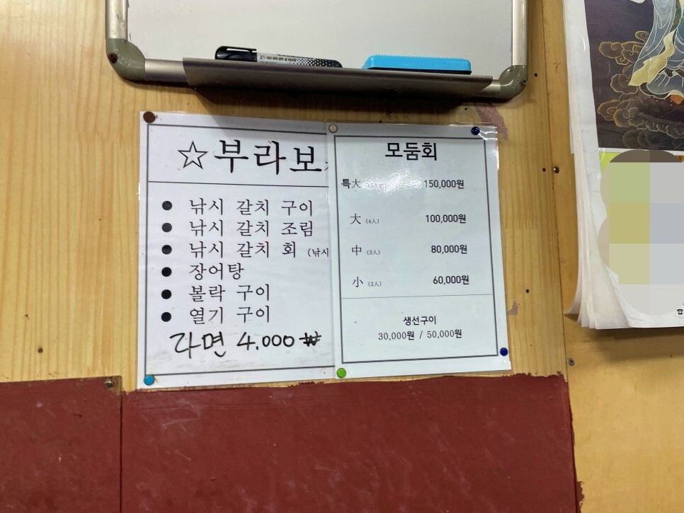 메뉴판을 찍어봅니다. 꽤 단출해요. 저희는 2명이라 모둠회 소자 (60,000원)와 부산 사람 부산 소주 대선 한 병 주문해 봅니다.