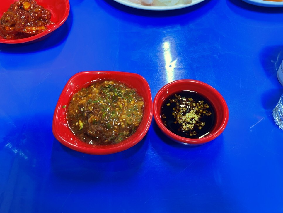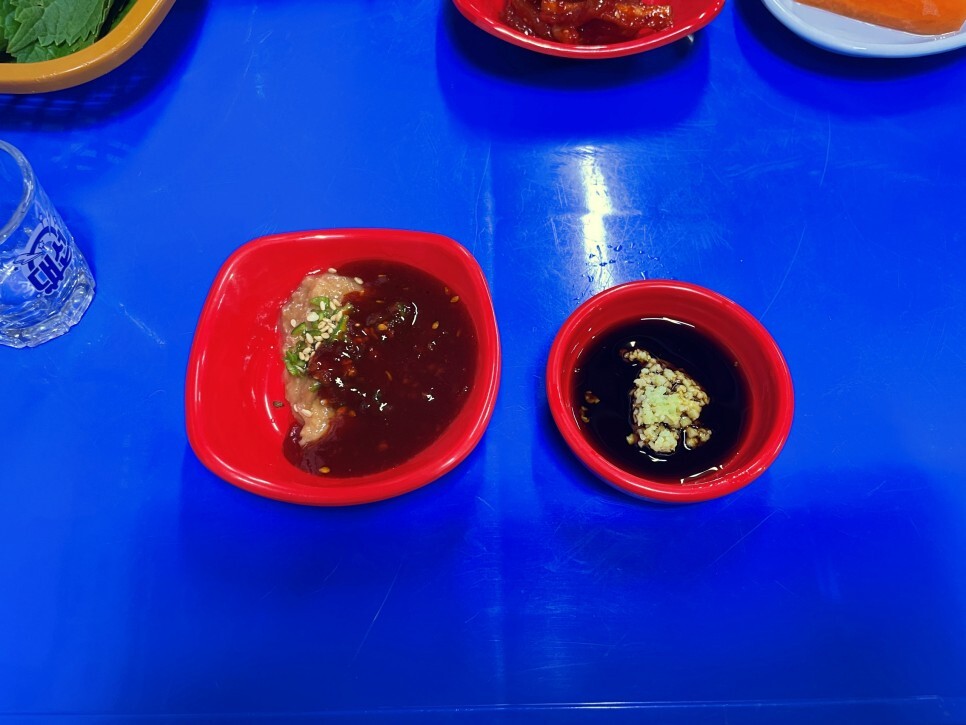 쌈장에 초장을 부어 섞어봅니다. 와사비에는 간장을 부어줍니다. 초장을 맛보니 깨소금이 섞여있고 조금 묽은 걸 보니 초장은 직접 만든 것 같습니다. 와사비 역시 생와사비네요. 좋습니다.
