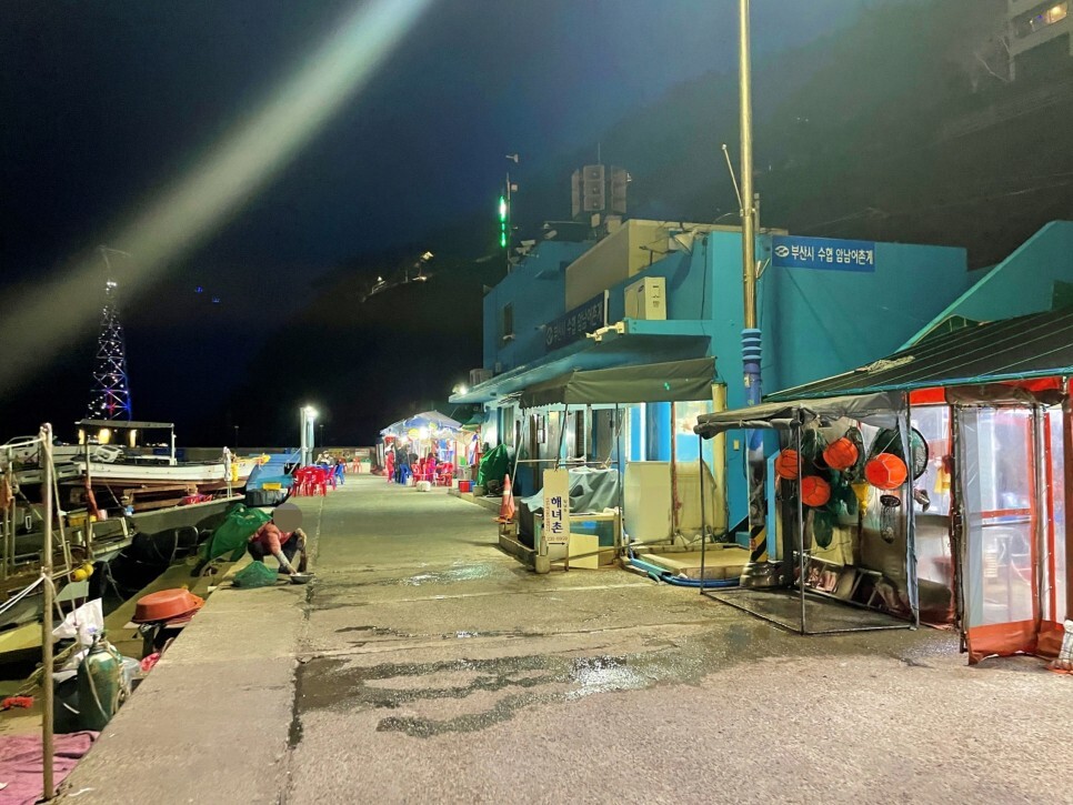 해경 초소, 해녀들의 공간, 어촌계, 그리고 포장마차촌이에요. 작은 어촌마을의 모습을 보는 것 같아서 정겹습니다. 저 뒤로 반짝이는 철탑이 보이는데요. 송도 해상 케이블카의 모습입니다.