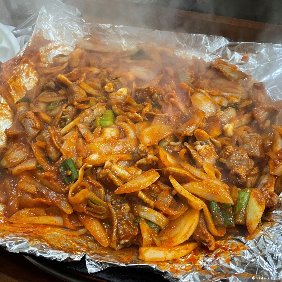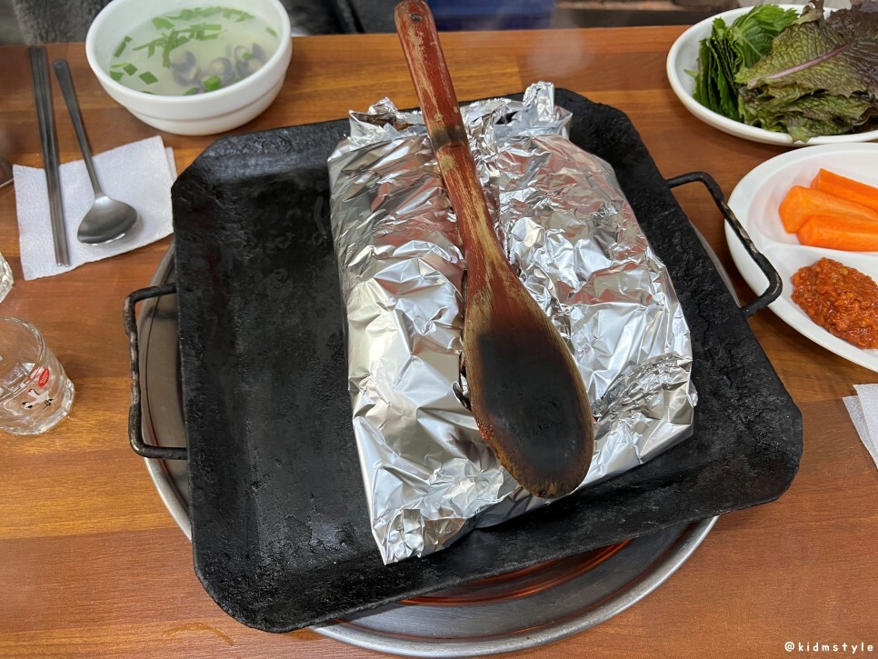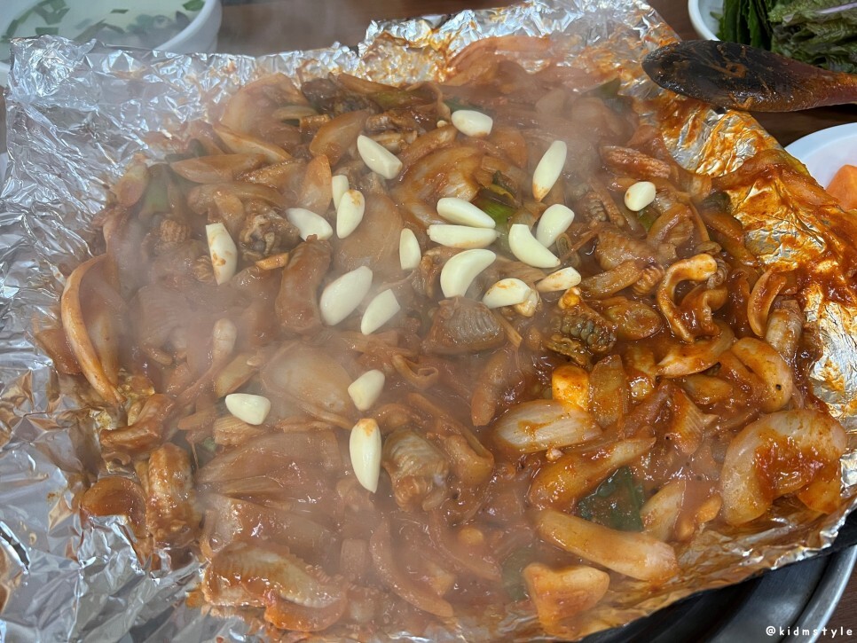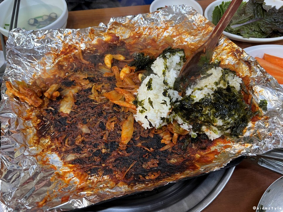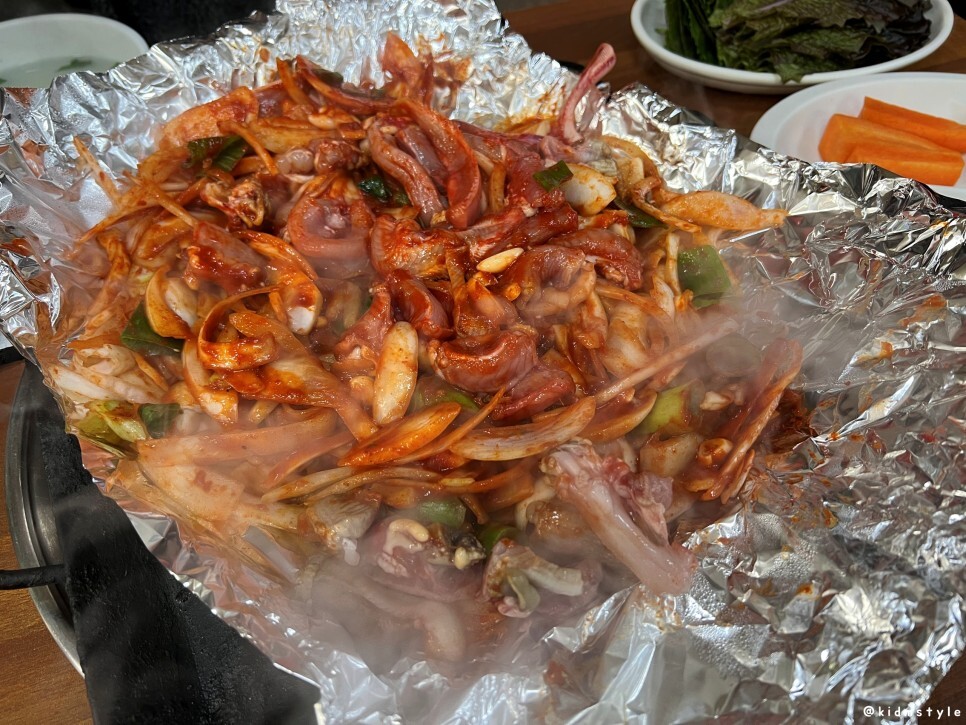 꼼장어가 나오고 불판에 올라가고 호일로 감싸고 주걱으로 덮어주고