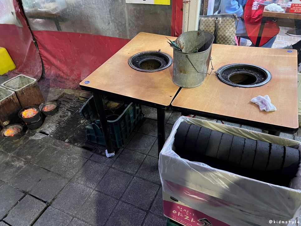 연탄은 아니고 납작한 야자숯이다. 불이 잘 붙고 화력이 좋아서 식당에서 애용하는 아이템이다.