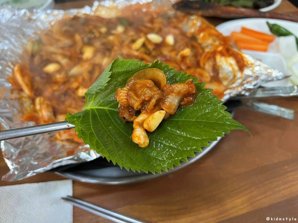 숟가락 위에 깻잎 한 장 올리고 꼼장어 올려서 입으로 바로 팍.