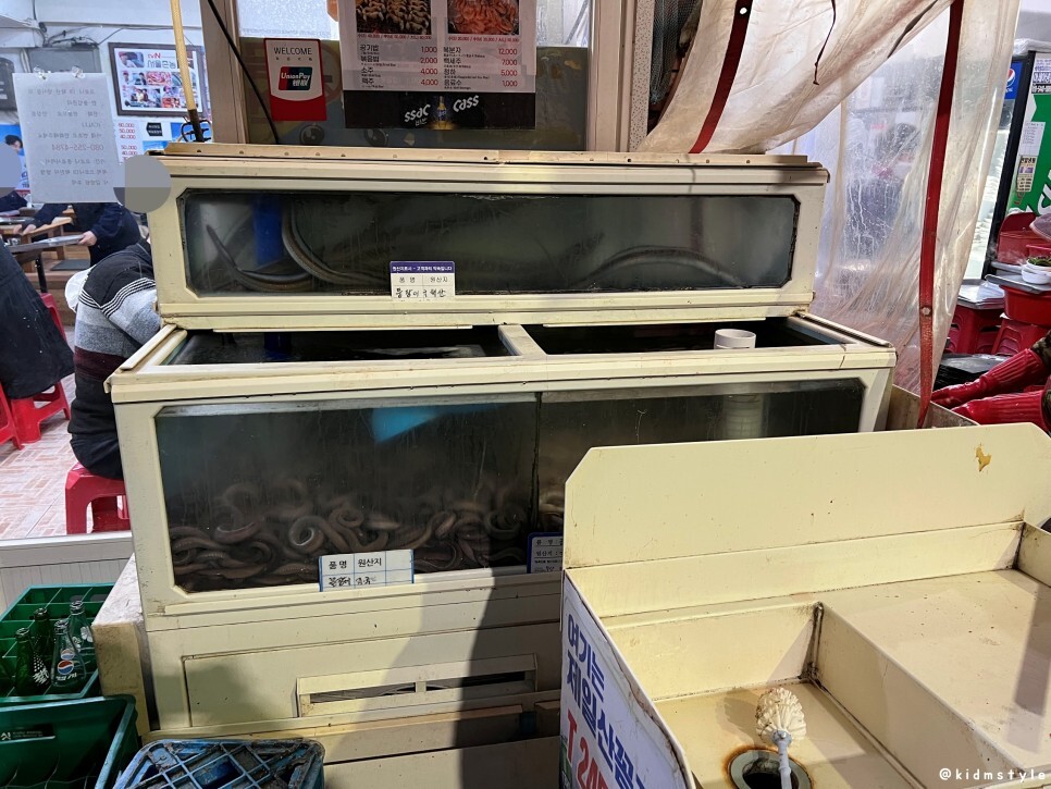 국내산, 미국산 꼼장어가 수조에 한가득