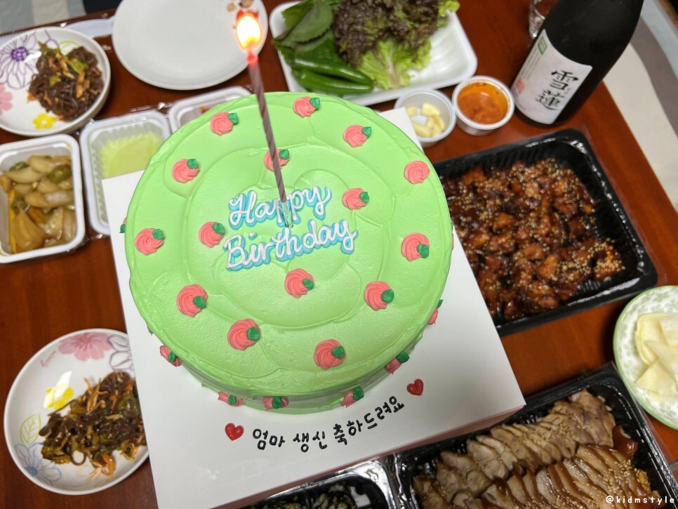 엄마 생신이 설 연휴 며칠 뒤라 앞당겨서 케이크를 준비했다. 과일을 좋아하시는 엄마를 위해 직접 디자인해서 주문한 수제 주문 케이크이다. 동생네가 특별히 준비했단다.