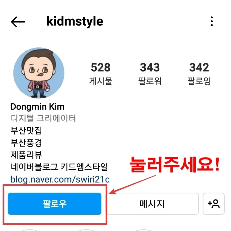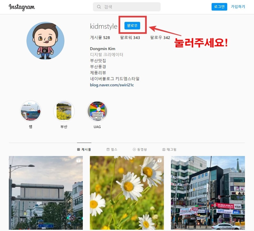 인스타 검색란에 '키드엠의동네산책', '키드엠의맛집' 등의 태그와 '@kidmstyle'로 바로 검색하고 들어오셔도 됩니다.