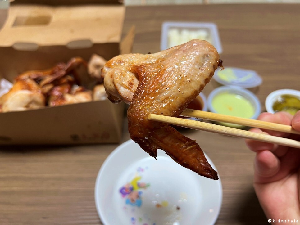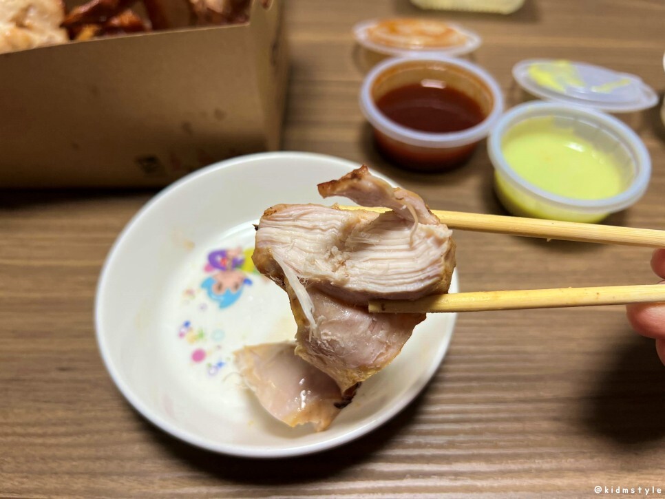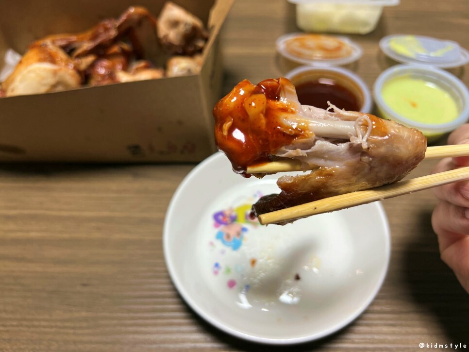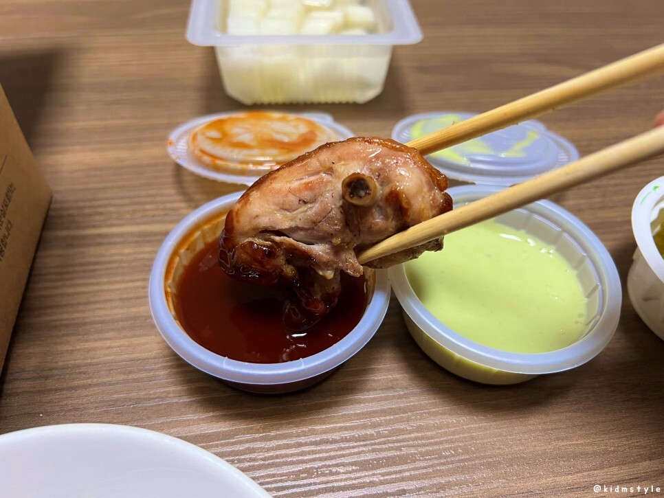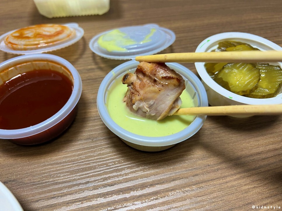 마요 와사비 소스도 듬뿍 찍어서 맛본다. 와사비의 맛이 치킨의 맛을 더 끌어올려 준다.