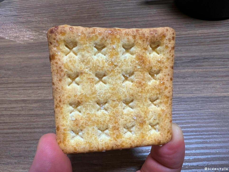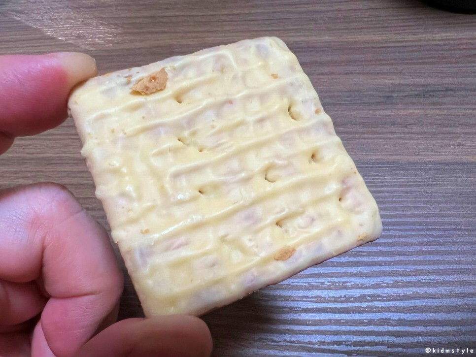 하나 꺼내서 잡아보았다. 한쪽 면에는 치즈크림이 발라져 있다. 가만히 놔둬도 초콜릿처럼 쉽게 녹지는 않지만 입안에 들어가면 금세 녹아서 과자와 잘 어울리는 치즈크림이다.