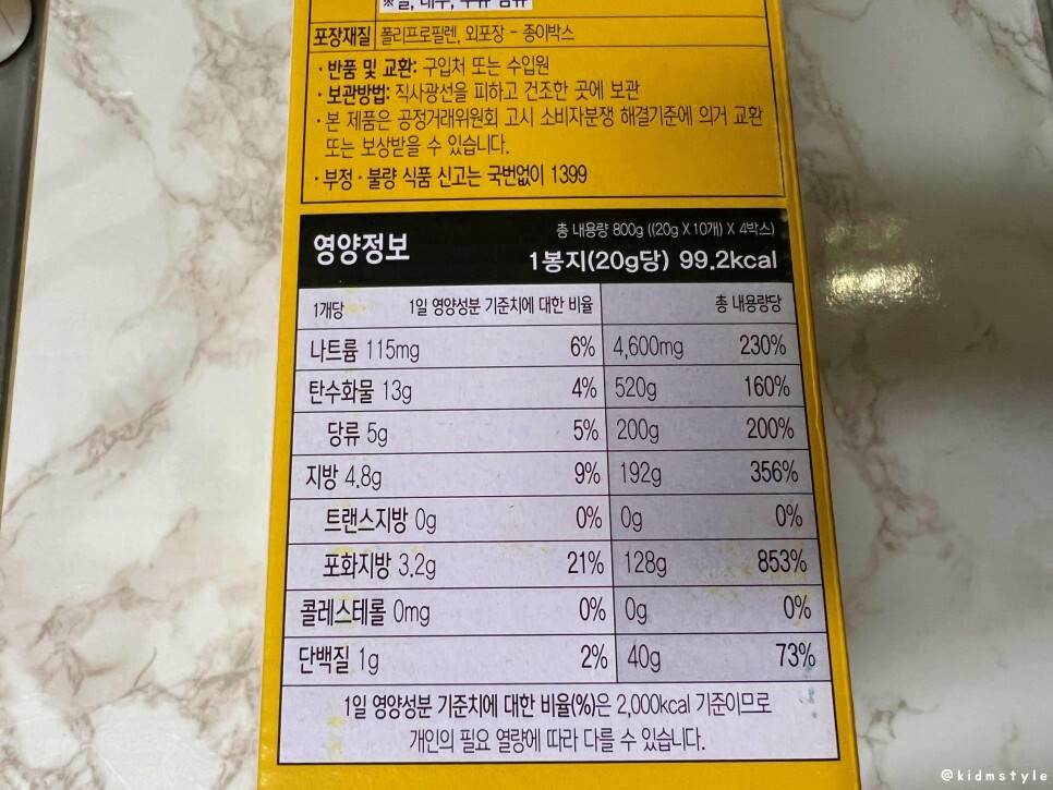 가격은 20g * 10개 * 4박스 총 800g 한 상자에 8,480원으로 저렴한 편이다.
