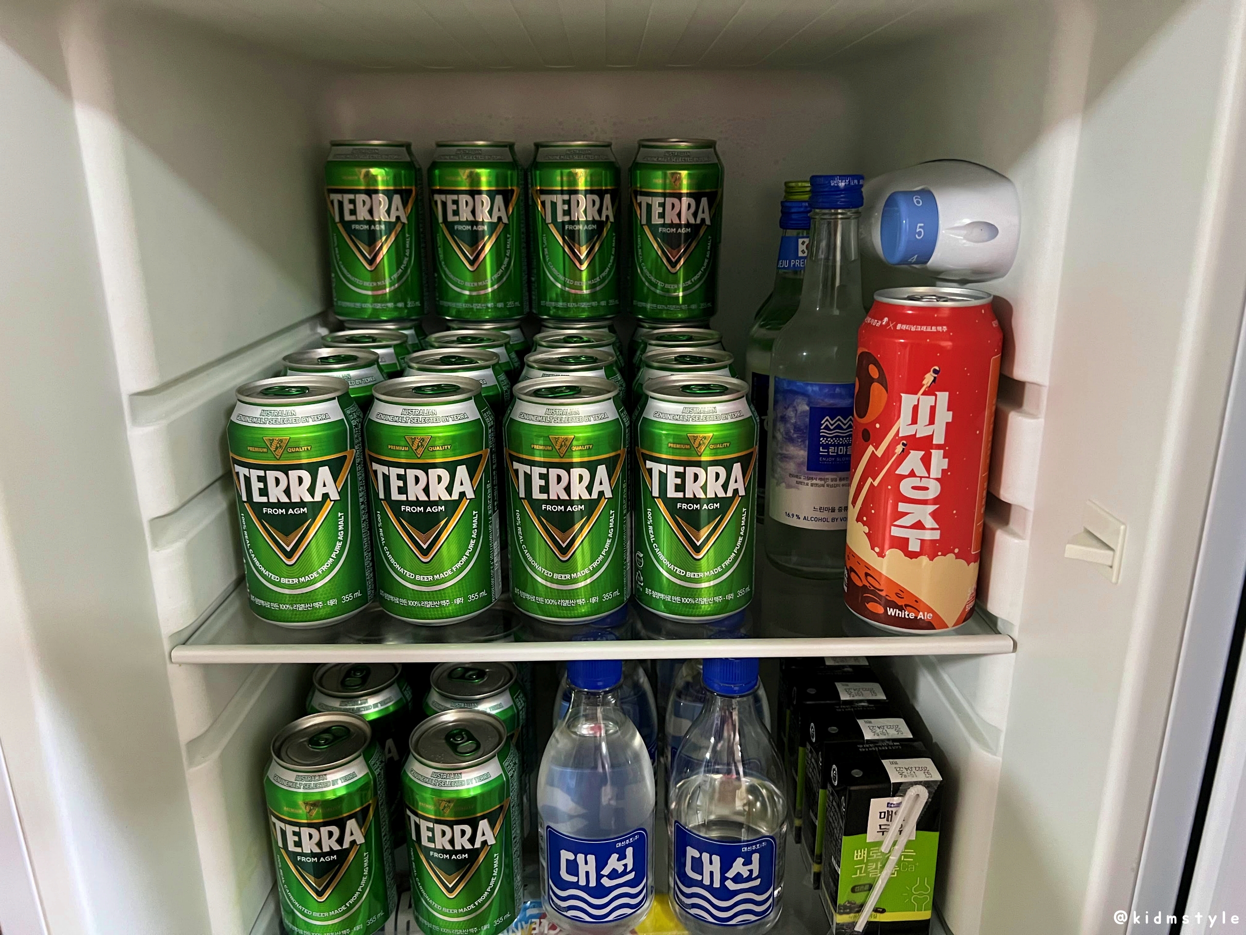 그래서 이 작은 냉장고를 술장고라고 부른다. 보통 다양한 맥주가 들어가 있는데 마침 텅 비어서 테라로 가득 채워본다. 소주와 두유도 눈에 들어온다. 이렇게 넣어 놓는다고 해서 절제 못하고 들이붓는 스타일은 아니기에 걱정은 없다.
