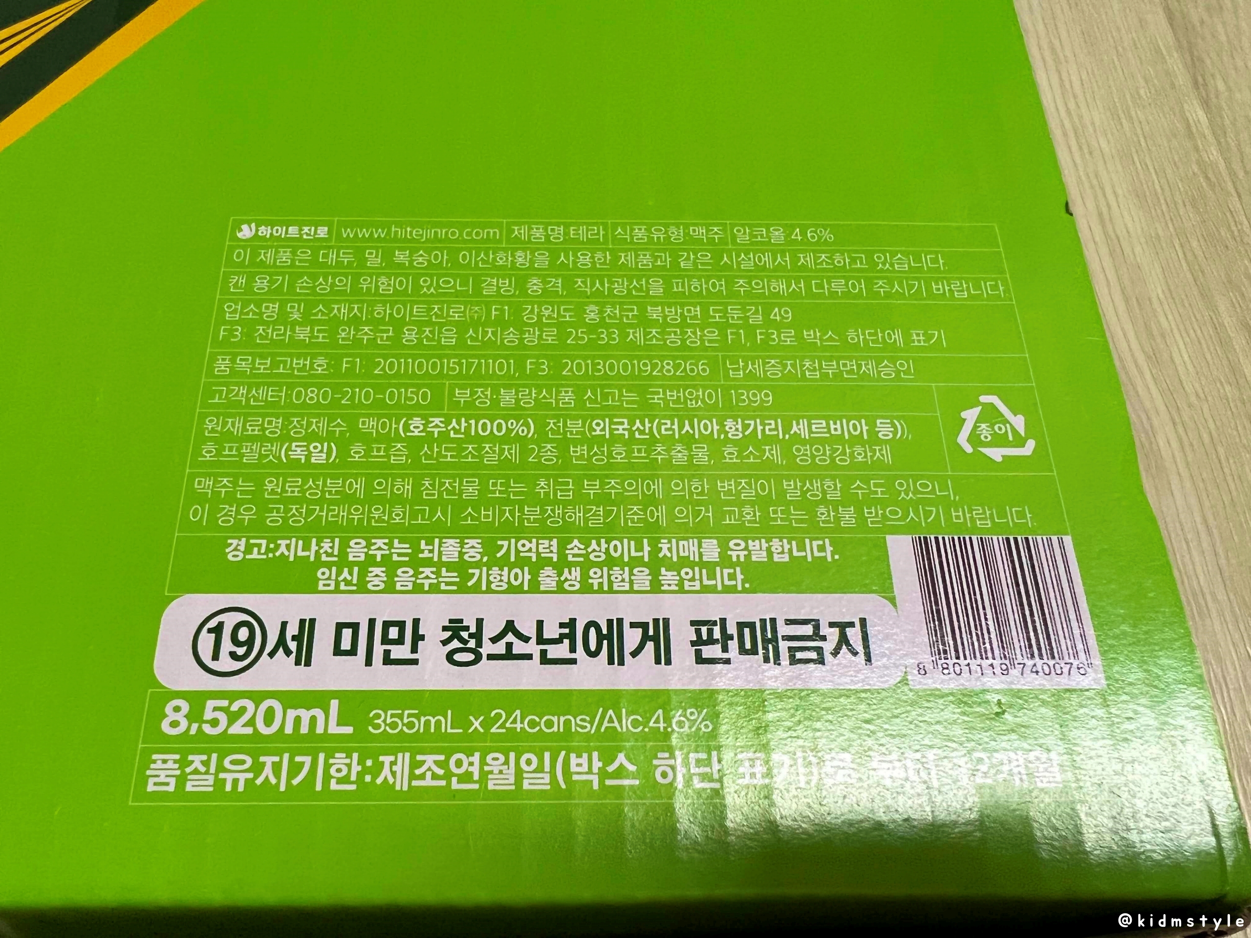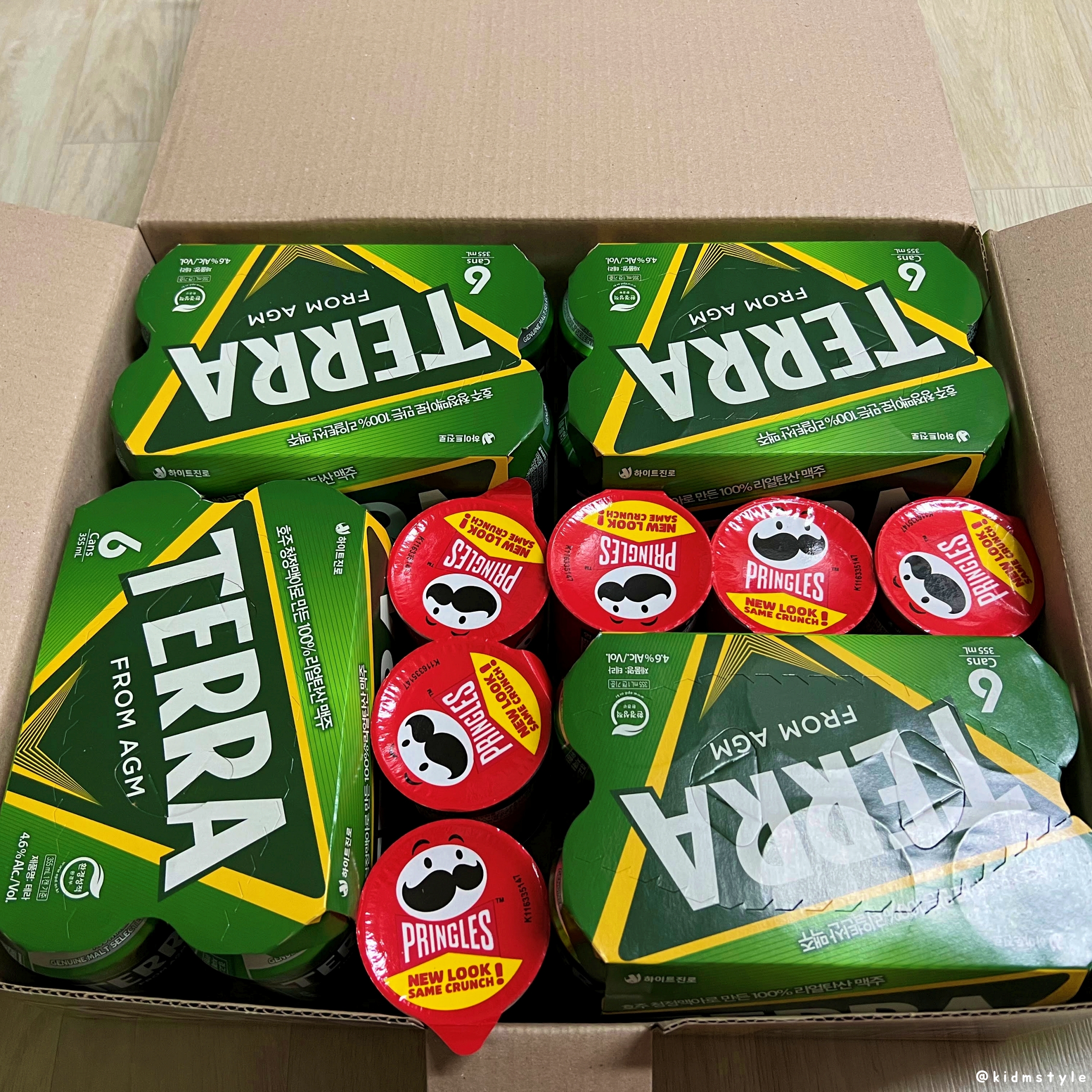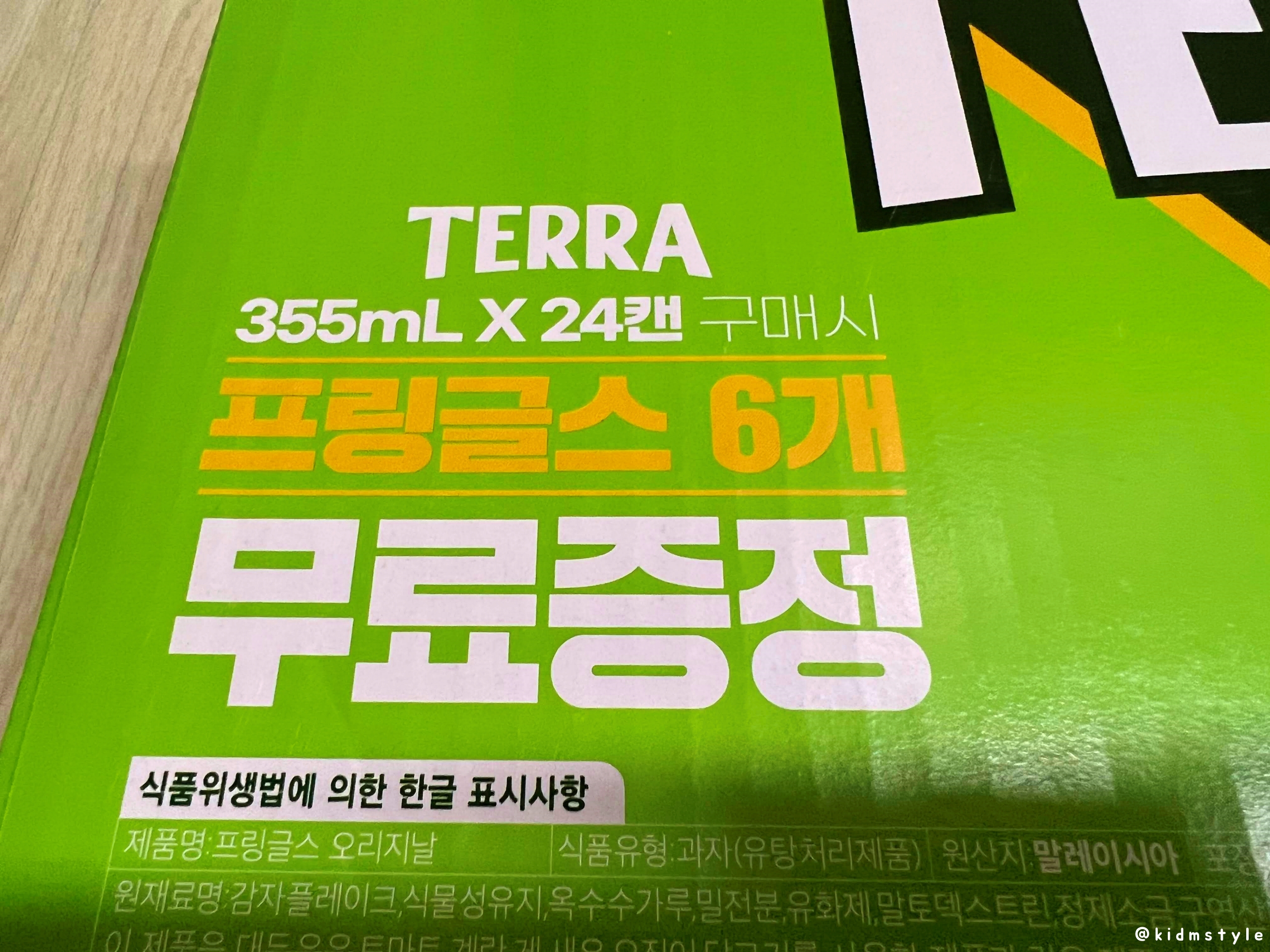 청정 라거 테라 terra 355ml * 24캔 박스이다. 수입 맥주도 즐기지만 기본적으로 테라를 재놓고 먹는 편이다. 소맥으로도 좋고 가볍게 한잔하기 딱 좋다.