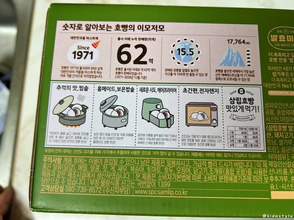 1971년 출시되어 50년 넘게 사랑을 받고 있는 간식, 호빵이다. 이제는 찐빵이라는 원래의 이름보다 호빵이 더 익숙하다. 찜솥, 보온밥솥, 에어프라이어, 전자레인지 등 다양한 방법으로 데워먹을 수 있다.
