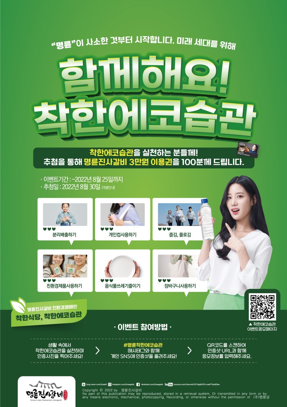하나는 분리배출하기, 개인컵사용하기 등 착한에코습관을 실천하는 인증샷을 sns에 올리면 추첨을 통해 명륜진사갈비 3만 원 이용권을 100명에게 제공하는 이벤트이다.