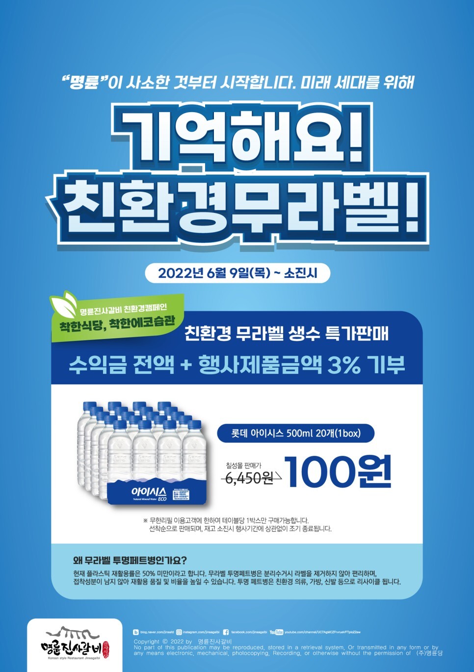 다른 하나는 6월 9일부터 전국 명륜진사갈비 매장에서 무한리필 이용 시, 아이시스 친환경 무라벨생수 1박스 (500ml * 20병)를 100원에 구입할 수 있는 이벤트이다. 수익금전액 및 행사제품금액 3%를 기부하는 의미있는 행사이다. 나중에 계산하면서 보니 생수가 꽤 남았더라. 최소 100원 이상 기부를 하면 생수 1박스를 가져갈 수 있는데 차가 없는 관계로 마음만 동참했다.