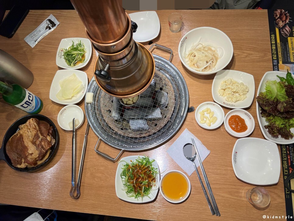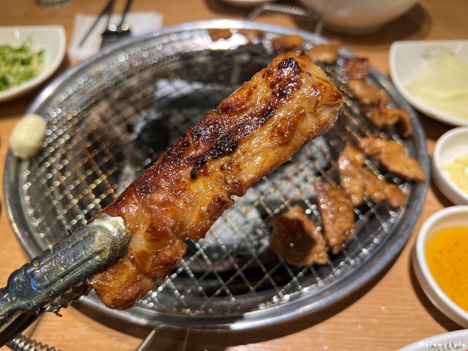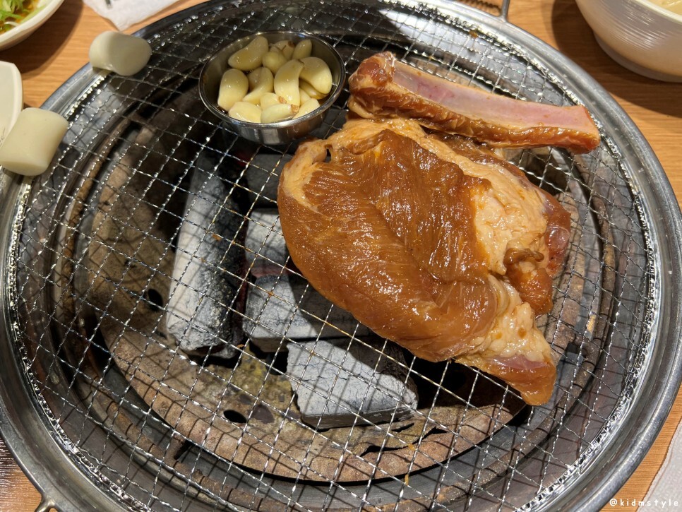 큰 갈빗대가 붙어있다. 마늘에 참기름을 부어서 굽는다. 불판은 1회용 불판인데 너무 가벼워서 고기를 뒤집거나 할 때 약간의 주의가 필요하다.