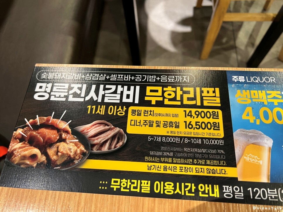소주는 4,500원이며 사이드 식사 메뉴도 몇 가지 있다. 무한리필은 평일 2시간 이용, 주말, 공휴일은 1시간 40분을 이용할 수 있다.