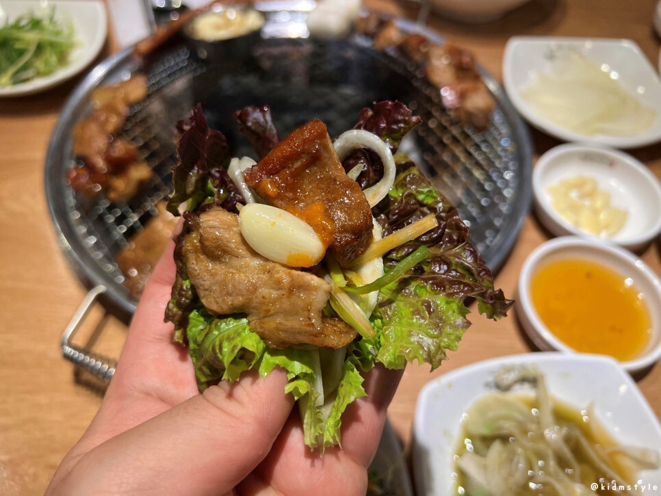 갈비 한 점, 목전지 한 점 쌈 싸서 먹어준다.