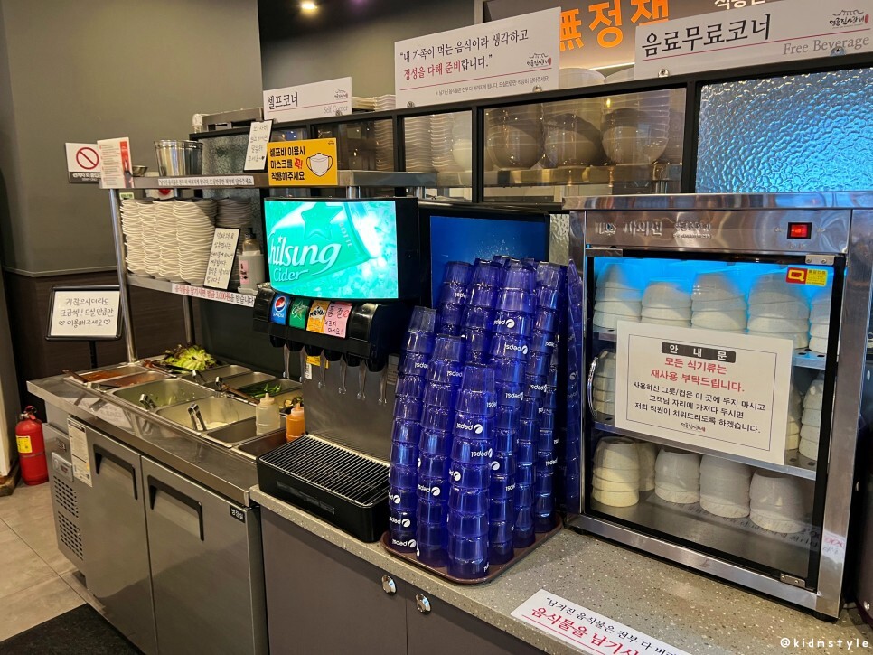 셀프 코너의 모습이다. 음료수도 무한이며 밥도 무한이다. 밥이 필수인 분들에게는 참 반가운 서비스인 것 같다.