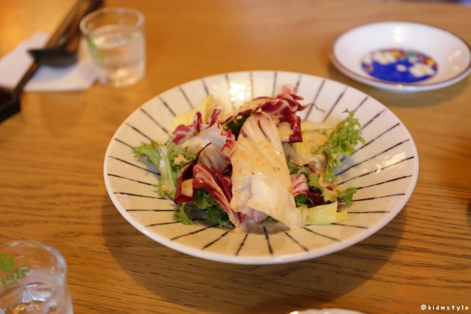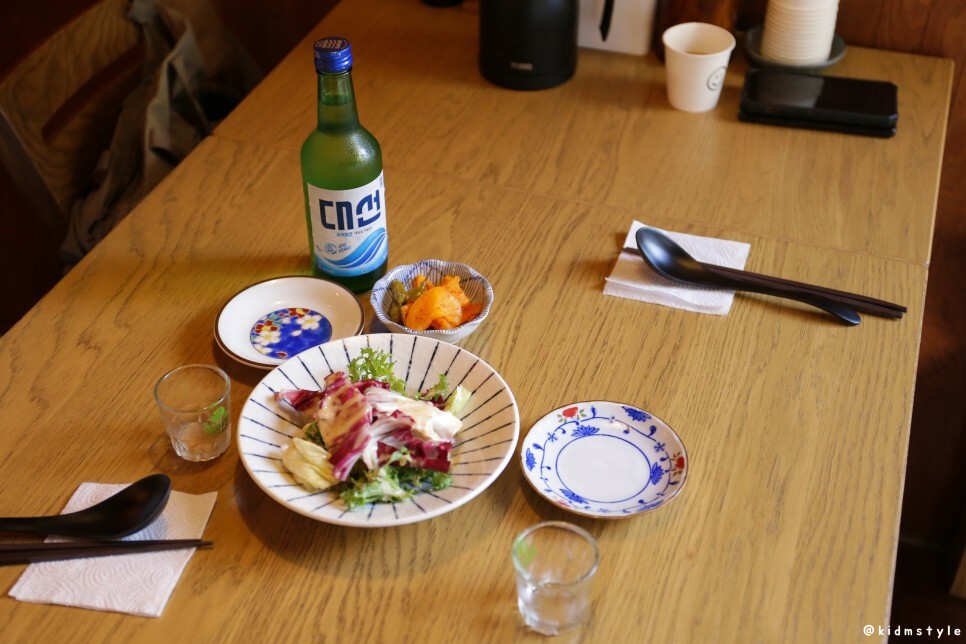 먼저 샐러드와 산고추, 단무지 절임 등이 나왔다. 이걸로 소주 한잔 먼저 해본다.