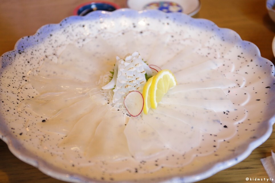 비주얼이 상당히 좋다. 칼질이 참 잘 된 오징어 회, 그리고 가운데에는 살짝 불을 입힌 오징어 다리가 반기고 있다.