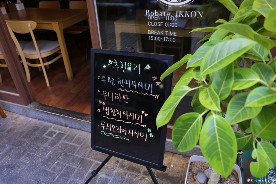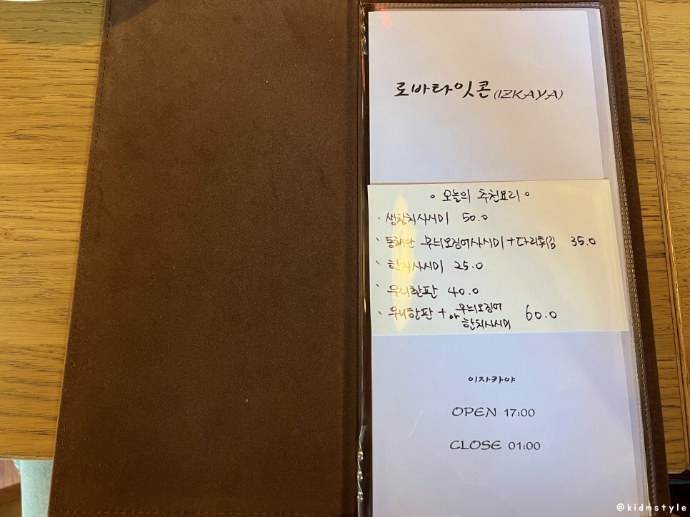입구에 추천 요리가 적혀있다. 들어가기 전부터 한치 사시미와 무늬오징어 사시미가 눈에 들어온다. 한치나 오징어회를 안 먹은 지 오래돼서 벌써부터 군침이 돈다.