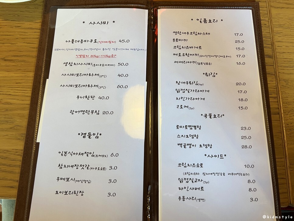 사시미 메뉴에 나폴레옹마구로가 이 집의 시그니처 메뉴라고 사장님이 귀띔해 주신다. 후토마끼, 산더미 생참치, 우니, 연어 알이 올라간 메뉴인데 적극 추천하시더라. 곁들임 메뉴와 일품요리에는 명란 새우 크림 파스타, 후토마끼, 크림치즈 바게트, 메로유한야끼 등 다양한 요리가 준비되어 있고 튀김류, 국물요리, 사이드 메뉴 등 꽤 다양한 메뉴가 있어서 취향껏 주문하여 술 한잔하기 좋겠다.