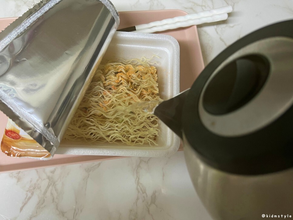 면이 잘 안 퍼지므로 정수기 온수보다는 커피포트 등 끓는 물을 부어준다.