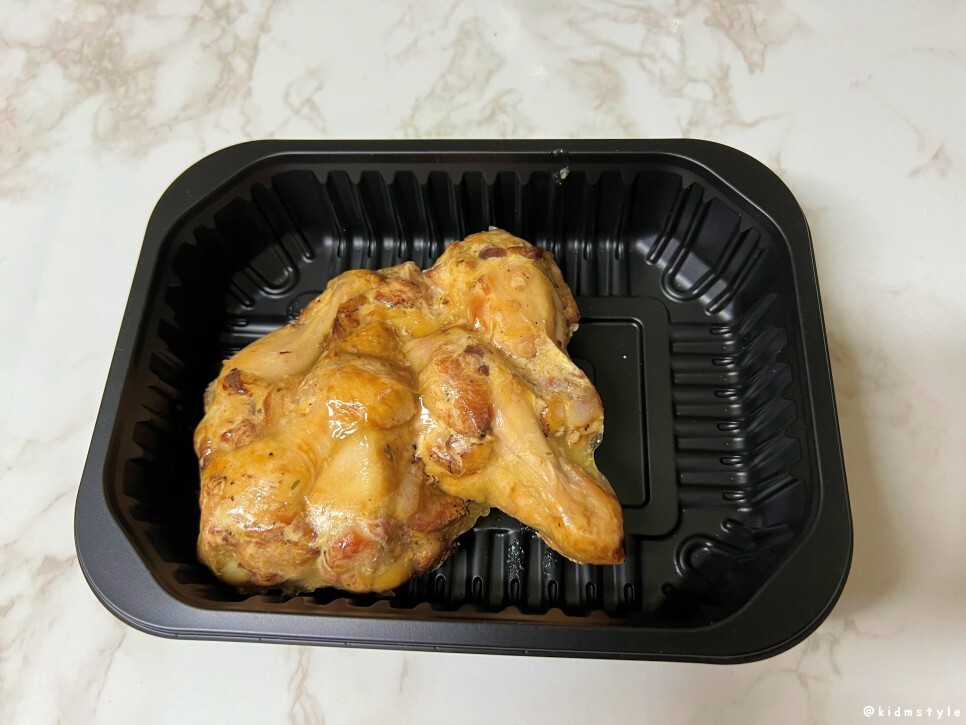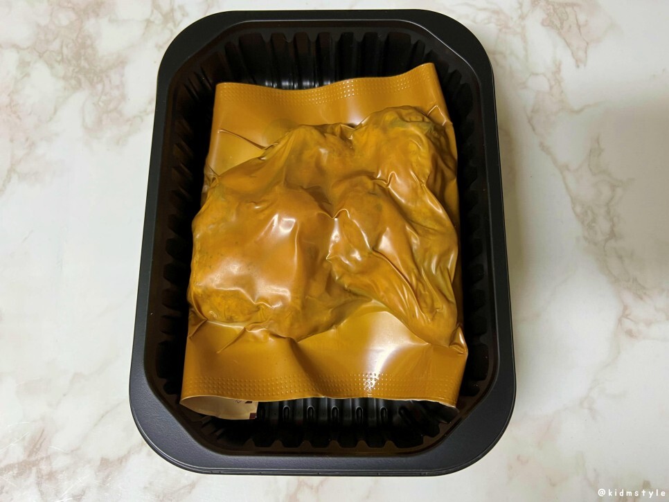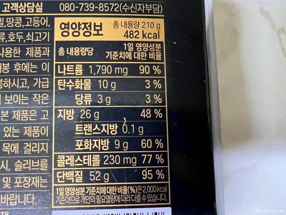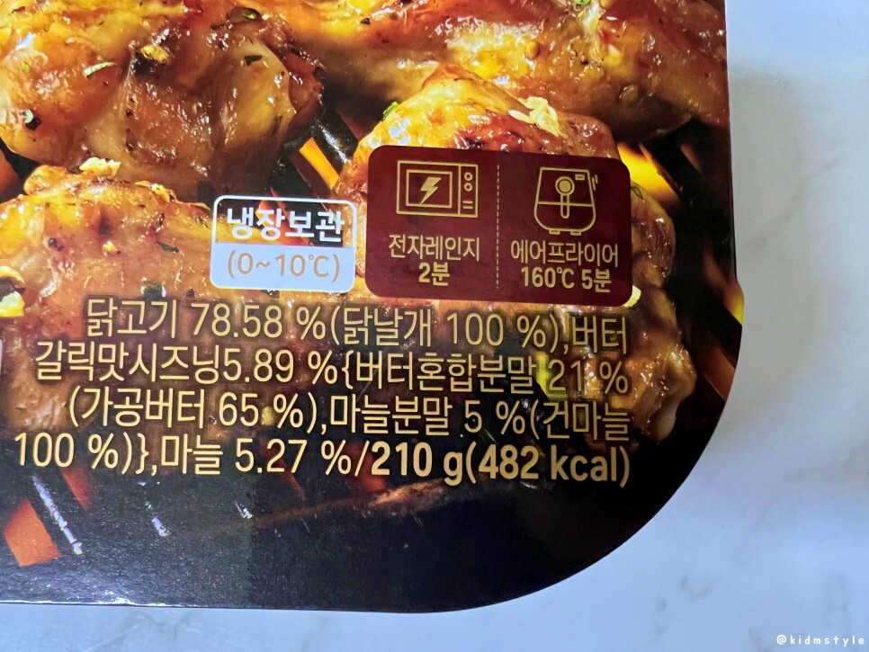 조리방법은 전자레인지 2분 또는 에어프라이어 160도에 5분이다. 닭고기가 78% 이상이며 210g에 482kcal이다.