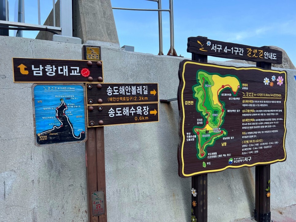남항대교를 건너 송도 쪽에 발을 내디뎠습니다. 안내가 잘 되어 있어서 길 찾기가 쉬워요. 이 구간에 갈맷길 보행로를 정비하고 있는 모습이 보이네요. 더 나은 보행환경을 기대해 봅니다.