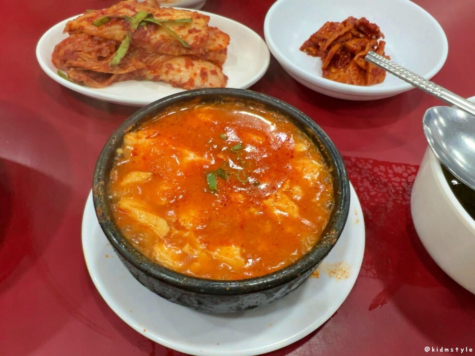 그리고 스텐 대접에 밥, 흰 접시 위에 뚝배기, 팔팔 끓는 순두부찌개가 반갑다. 세월이 지나서 나는 변했지만 너는 여전하구나.
