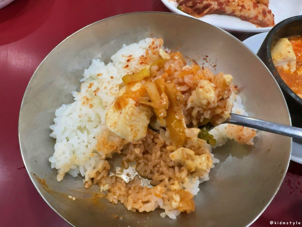 순두부찌개도 밥 위에 끼얹어서 맛본다. 오래간만에 맛보니 참 맛있네. 맛이 있어서인지, 지난 추억을 회상할 수 있어서 기분이 좋은 건지.