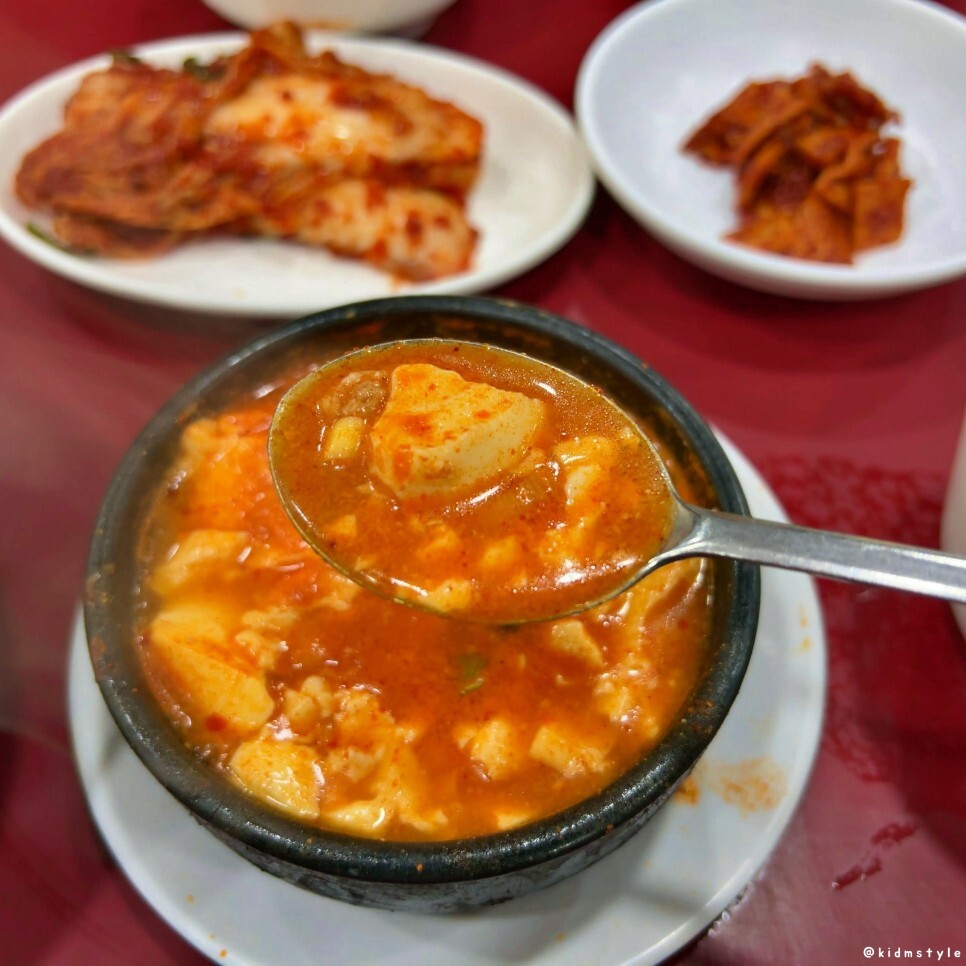 순두부찌개 오래간만에 한 숟가락 맛본다. 모두들 조미료 맛이라고 하는데 요리를 해본 사람은 알겠지만 흔히 말하는 조미료, 미원만 넣고 이 맛으로 끓이기가 상당히 어렵다. 단순히 조미료 맛을 넘어 분명히 비법이 있다. 보통 msg를 때려 넣은 음식은 조미료 향이 강한데 여기는 그렇지 않다.