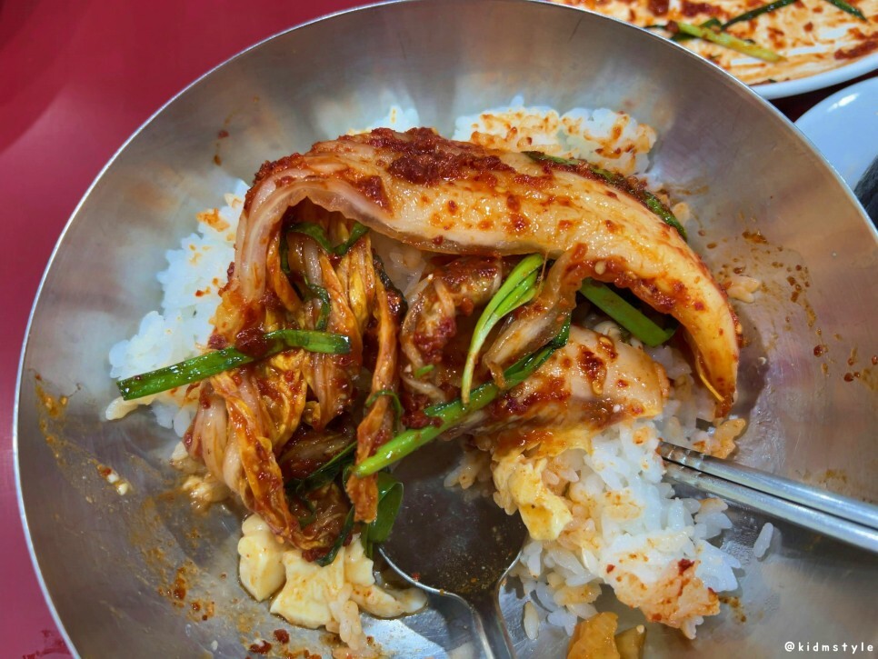 아예 김치를 양껏 올리고 먹는다. 이래 먹으면 참 맛있다. 비빔밥도 아니고.