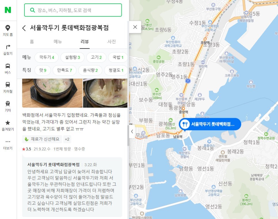 이 글을 쓰기 위해서 네이버지도 마이플레이스 리뷰를 우연히 살펴보았는데 광복동의 그 서울깍두기가 아니라는 말이 있네? 이걸 왜 이제야 봤지?