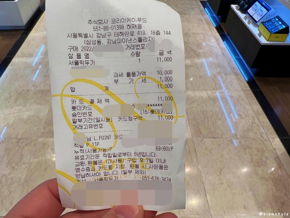 웬만하면 재방문은 없다 생각하고 별말 안 하는데 이날은 계산하면서 직원한테 이야기했다. 고기 맛보고 손님한테 내는 거냐고? 그런데 정성을 들여서 매일 준비하는 고기라는 이야기만 하네. 영수증을 보니 무슨 주식회사, 아 속았다. 11,000원도 아깝지만 든든한 한 끼를 제대로 하지 못한 게 너무 아쉬웠다. 백화점에 정말 자주 가는데 아직도 이 매장 지나갈 때마다 그날의 아쉬움이 번뜩 생각난다.