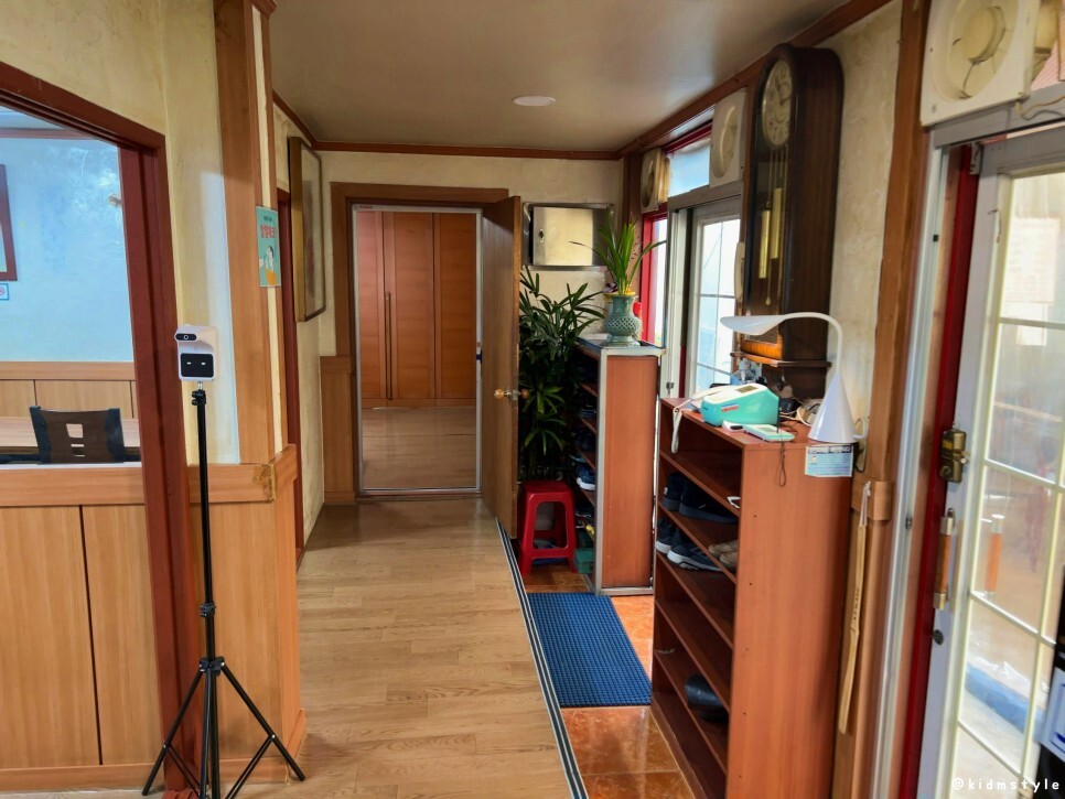 신발장에 신발을 넣으면 되고 정면 안쪽에도 좌석이 많다. 코로나19가 정점을 찍던 시점이라 발열 체크도 하고.