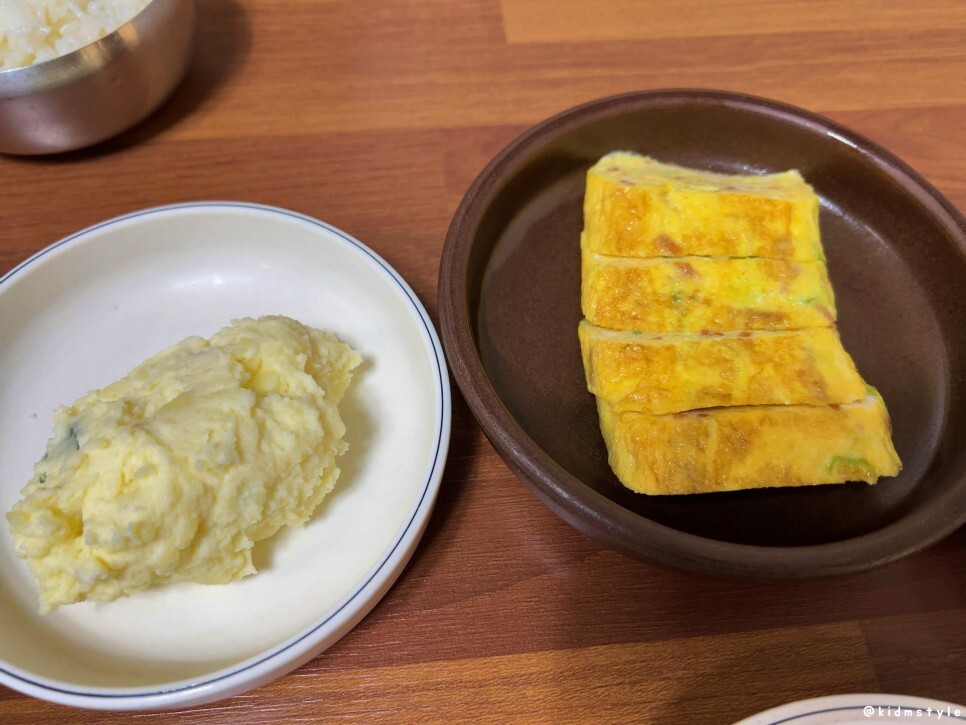 으깬 감자샐러드, 계란말이가 나오고
